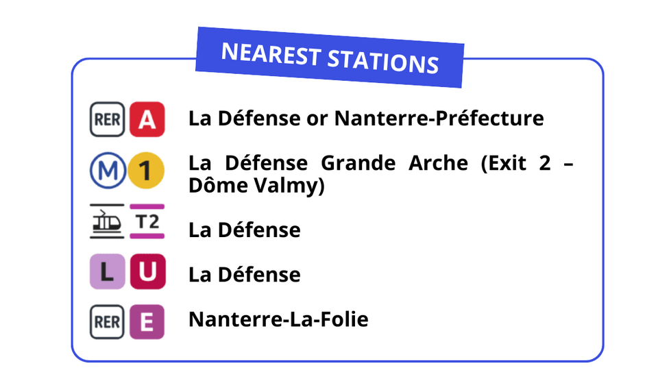 | Location | 99, Jardins de l’Arche, 92000 Nanterre (Upon arrival at the Arena, the entrance will be "Gate 33") In the heart of the La Défense business district, just 10 minutes from Porte de Maillot and the Palais des Congrès. |